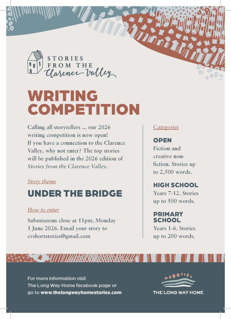 We mined the Clarence for a heart of gold, searching for stories. These excellent writers will be published in Stories From the Clarence Valley 2025 – Heart of Gold. We’ll announce the winners at the book launch on 9th December at Grafton Regional Gallery. The Long Way Home’s job is to unearth new writers. This year we’ve uncovered the beating, gleaming heart of the Clarence. Thankyou everyone for sending us your stories!